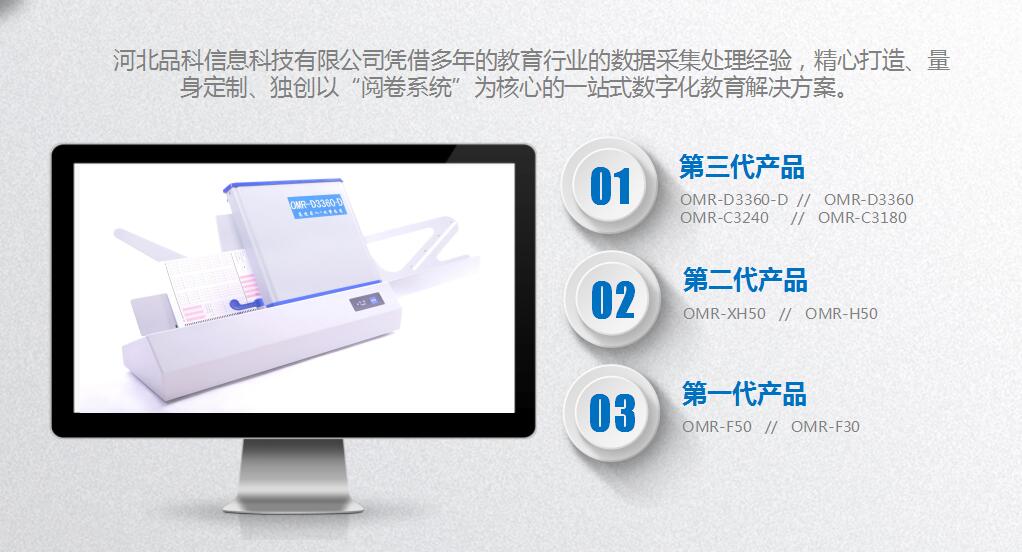 河北品科信息科技有限公司從事光標閱讀機、答題卡、網上閱卷系統、高速掃描儀、考試閱卷機等。主要服務于學校、教育機構、調查統計機構、監察機構等政府企事業單位的考核測評、調查統計的數據分析。